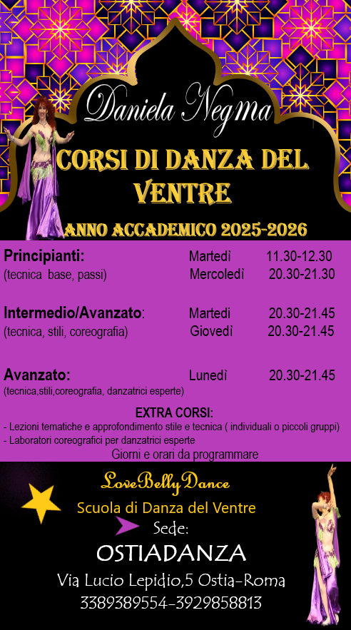 La gran parte dei corsi di danza orientale (danza del ventre) che tengo a Roma si svolge ad Ostia presso la scuola OSTIADANZA.